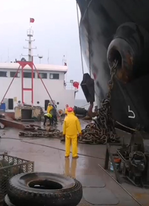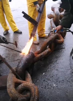 4、用專用機(jī)器夾住惰鏈,再用錨機(jī)把惰鏈放出擺在甲板上,等到另外的連接鏈環(huán)放到甲板上。
